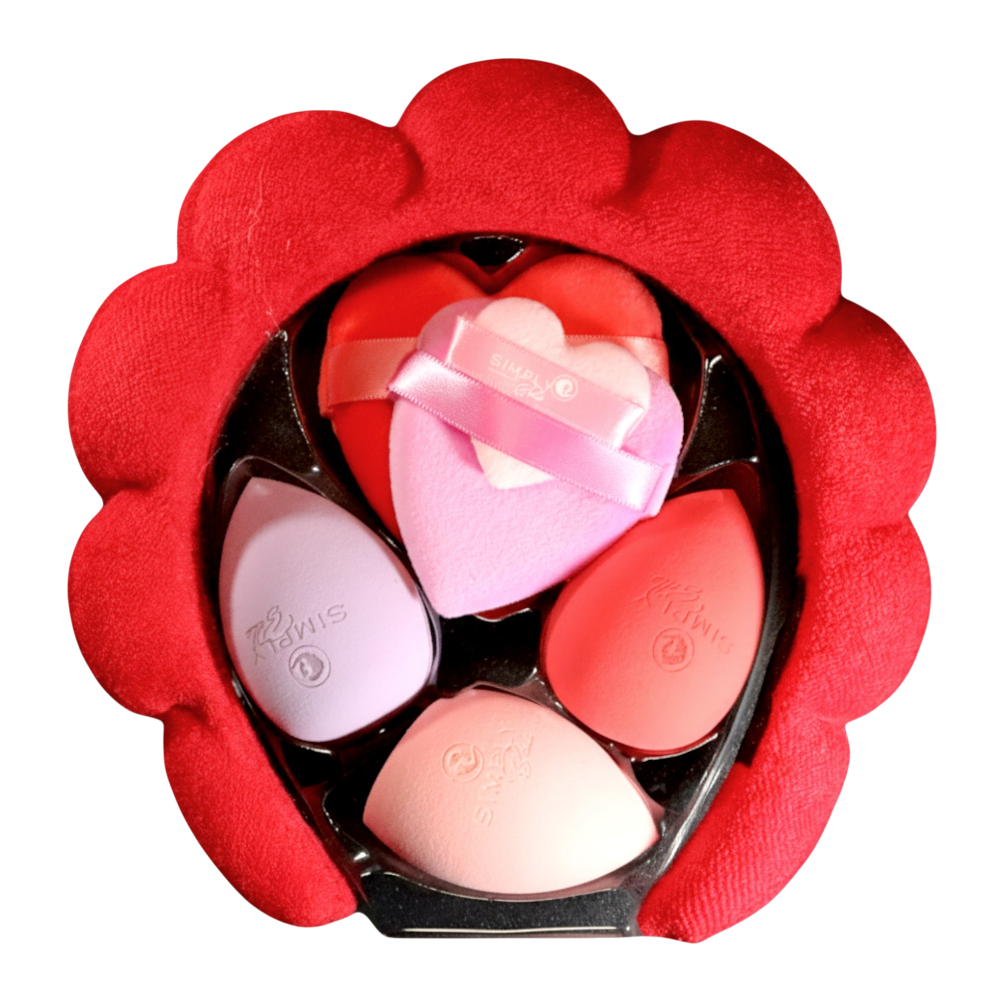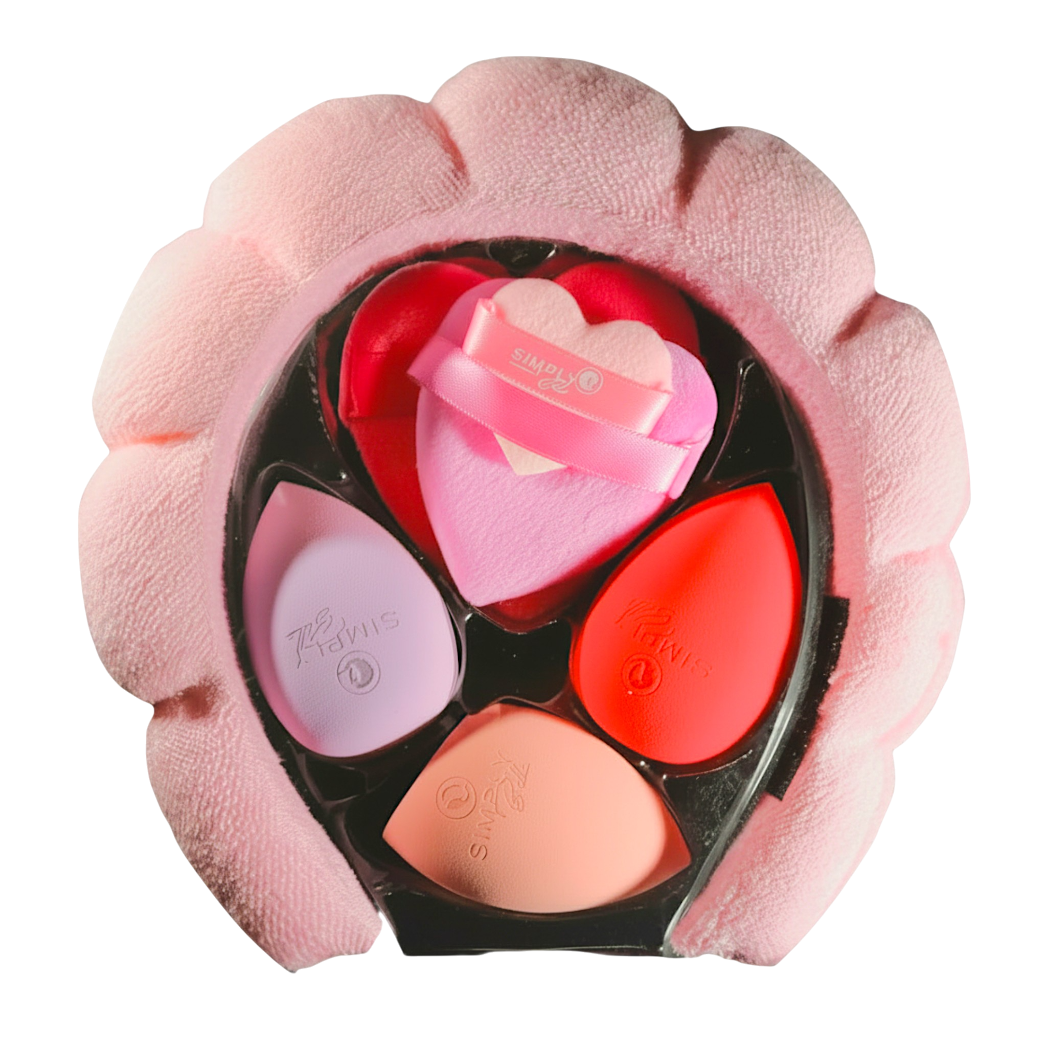 Blend and set your makeup like a pro with Simply Bella’s Beauty Blender + Powder Puff Set. Each set includes 3 ultra-soft beauty sponges and 1 heart-shaped powder puff, all neatly arranged in a matching plush flower-shaped headband case—available in Pink or Red.